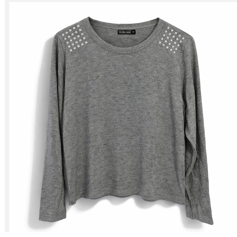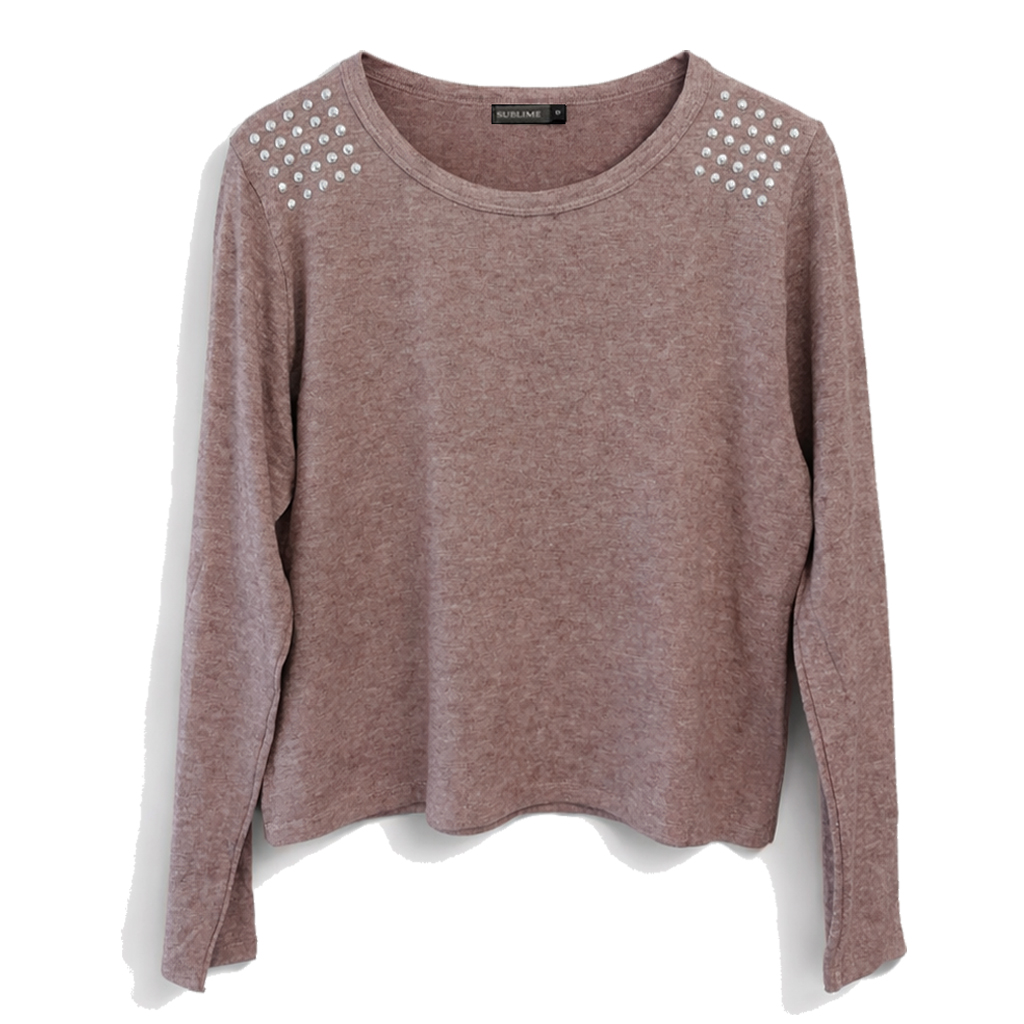 Suéter confeccionado en lanilla angora, con cuello redondo y mangas largas. Las charreteras con tachas en los hombros aportan un detalle sutil que levanta el look y le suma carácter